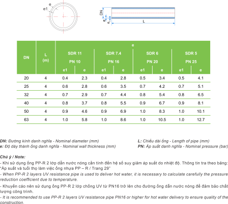 Thông số kỹ thuật của ống chịu nhiệt PP-R 2 lớp chống tia UV Tiền Phong