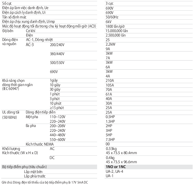 • Bộ tiếp điểm phụ: 1NO hoặc 1NC